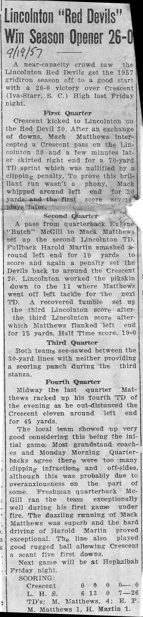 (LINCOLNTON, GA) Lincoln County whipped Randolph-Clay 43-6 here last Friday night as the Class A Division II playoffs opened. The local Red Devils will host Hawkinsville this Friday in the second round.