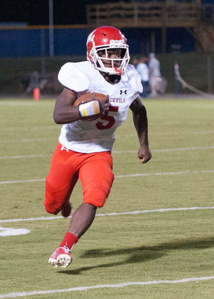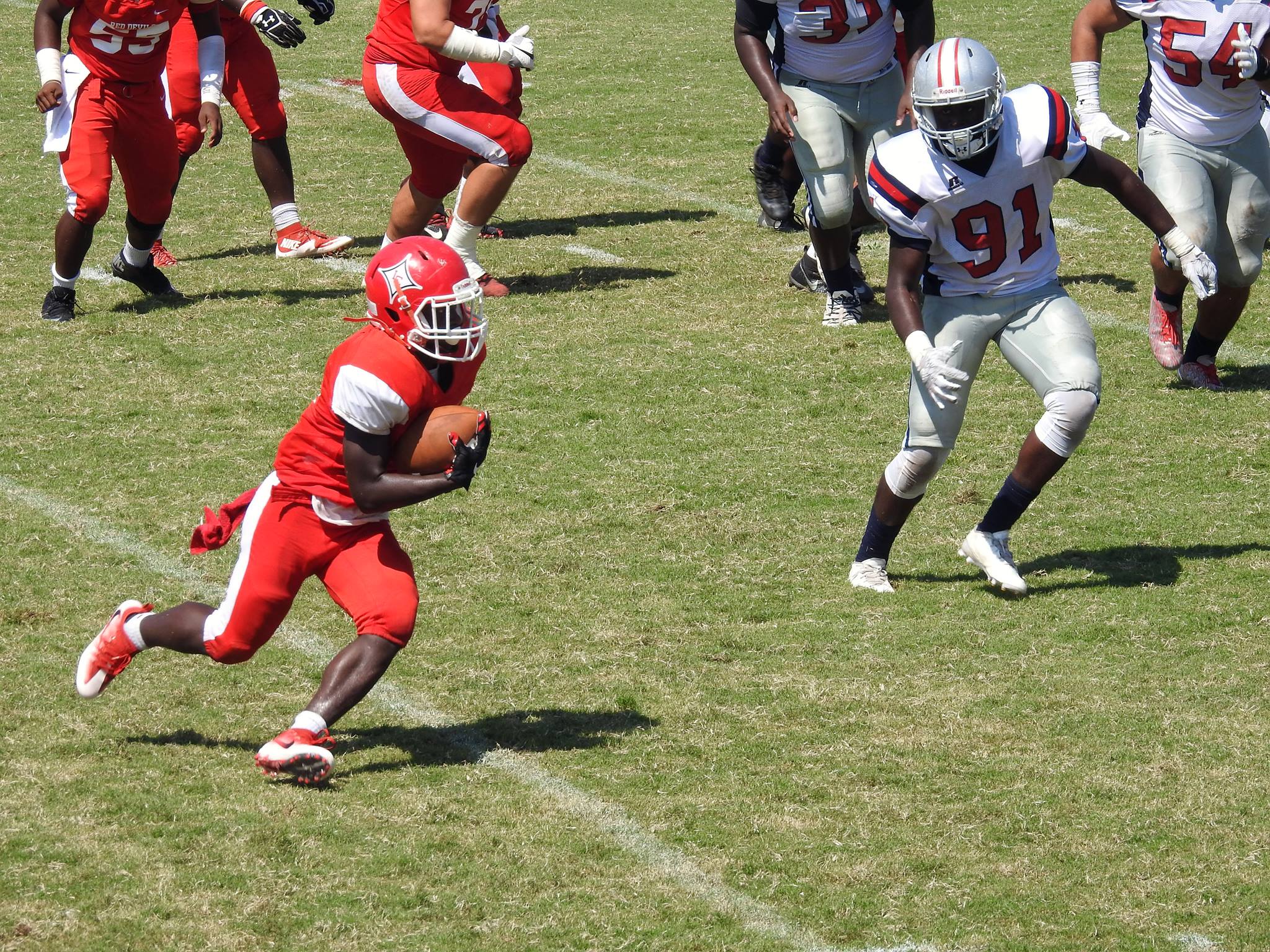 A Red Devil took a blow below the belt and went down on the field. Coach Bunch and others ran out to check on him, as he was grabbing his knee in pain. The Coach asked him how bad his knee was hurt, and the player managed to gasp that it wasn't his knee, and he would be ok in a couple of minutes. He returned to the game a short time later.